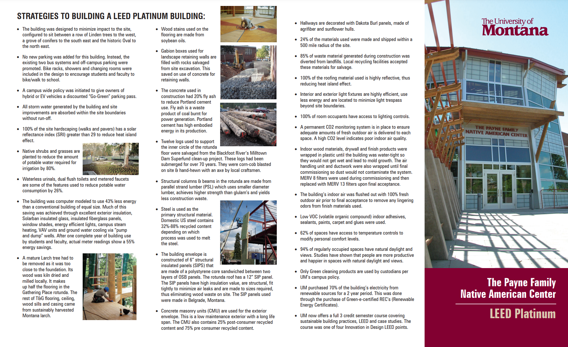 Inside, the center holds classrooms, conference rooms, office spaces, a student lounge, study areas and student meeting rooms. As a challenge to the campus precedent of red brick boxes for learning, this building makes a statement in steel and glass. Light and views play a symbolic role. Keeping with Native American tradition, the center’s main entrance faces east toward Mount Sentinel. 94% of occupied spaces have views to the outside. The metal roof features a long skylight recalling a traditional smoke hole and large-scale etchings in concrete demonstrate the abstract designs of Great Plains parfleche. Carved into exterior walls are the seals of Montana’s reservations as well as quotes from former University President George Dennison and Native American elders such as Earl Barlow and Joseph Medicine Crow. Native plant and herb gardens circle the center and symbolize the state’s reservations and the seven stars of the big dipper.
