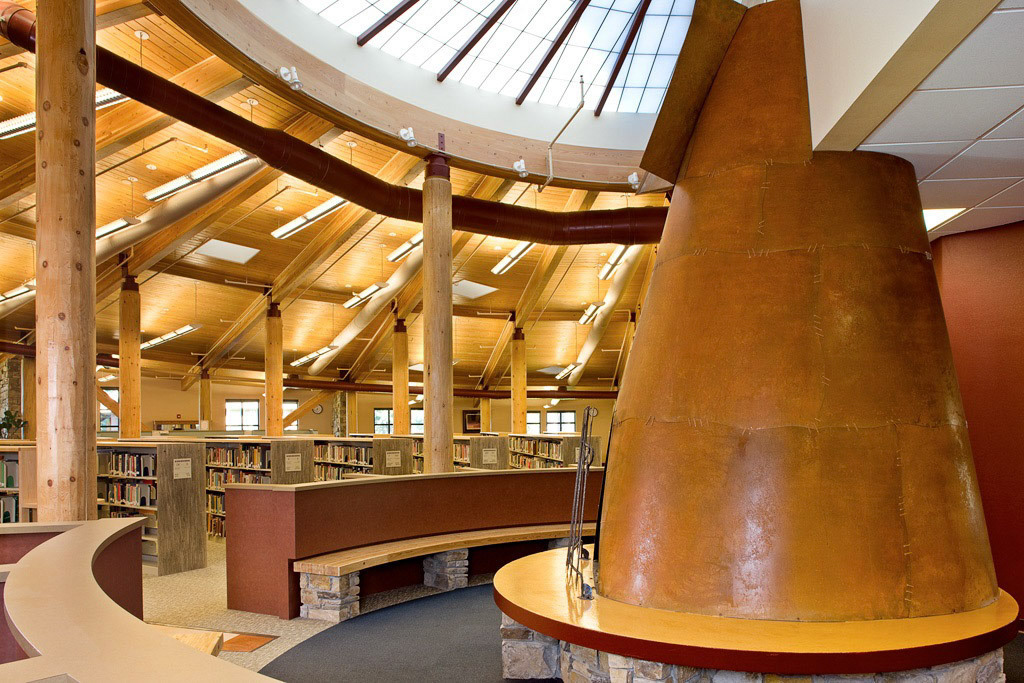 The structure of the buildings, which includes steel frame, glulam and log, are expressed as a ‘legible’ structure in the tradition of the tepee lodge, the sweat lodge, and sacred Sun Dance Lodge of the Crow. The buildings are culturally responsive-- textures, colors, space planning and building geometries are distinctly Crow. Research into Crow culture, numerology, cosmology, and Plains artifacts such as Crow Nation beadwork and parfleche are reflected in the building designs and details.